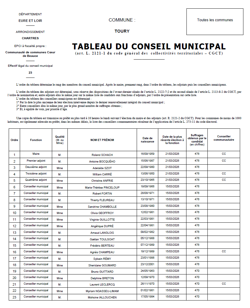 Suite au conseil municipal d'installation du 21 mars 2026, retrouvez ci-dessous le tableau du nouveau conseil municipal en place.